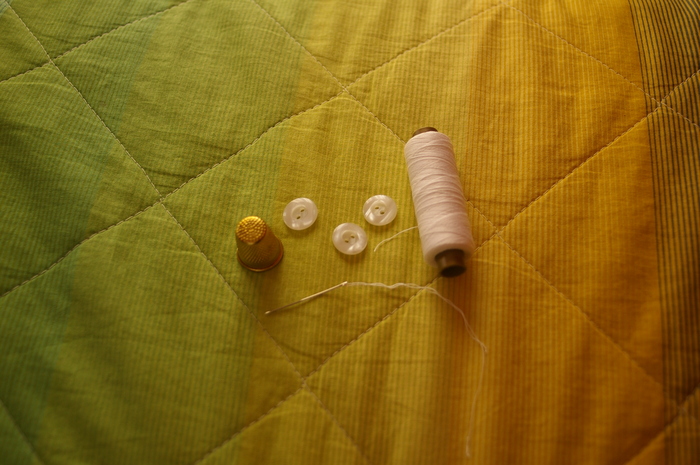 Mi armo quindi del necessario: ago, filo, i poveri bottoni (miracolosamente ritrovati) e - ultimo ma non meno importante - ditale! ...e la simpatica vestaglia, ovviamente.