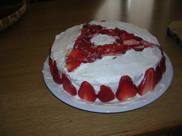 sembra proprio buona e pannosa!!!! mmmm e poi gnam le fragole... bravissima per la decorazione triangolare, scommetto che è stato uno sbatti..