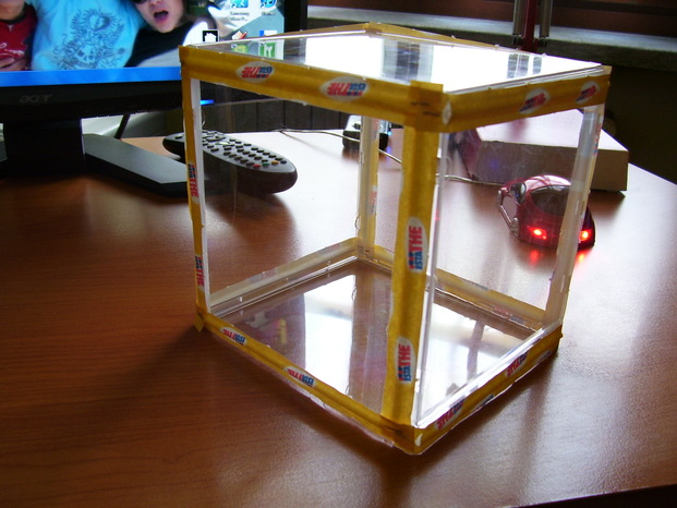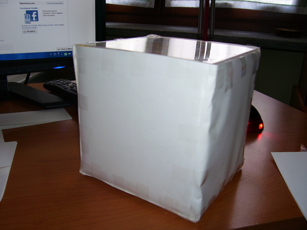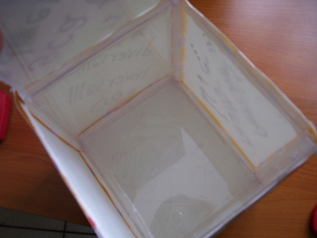 sono partito a creare la scatola da delle cannucce dell'estathè e le ho pinzate assieme per fare il telaio della scatola a forma di cubo...poi ho preso delle custodie di cd e le ho smontate in modo da fare rimanere solo la parte trasparente...poi le ho incollate al telaio di cannucce...poi ho preso dei fogli di carta bianchi, li ho tagliati adeguatamente e li ho incollati su tutte le facce del cubo...poi ho scritto su tutte le facce!!