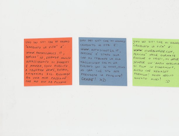 Realizza tre bigliettini con gli indirizzi dei tre siti web che hanno cambiato la tua vita. Descrivi perché li hai scelti, racchiudi i messaggi in tre ovetti di plastica, lasciali in luoghi pubblici in modo che suscitino la curiosità degli sconosciuti.