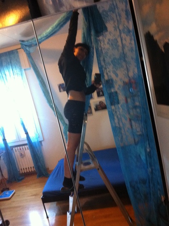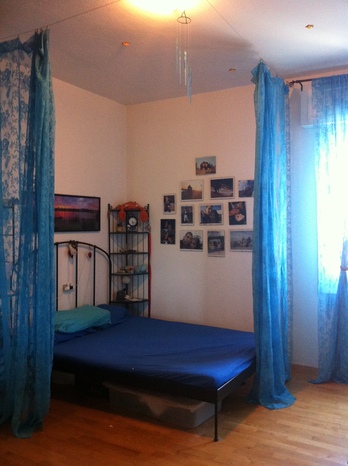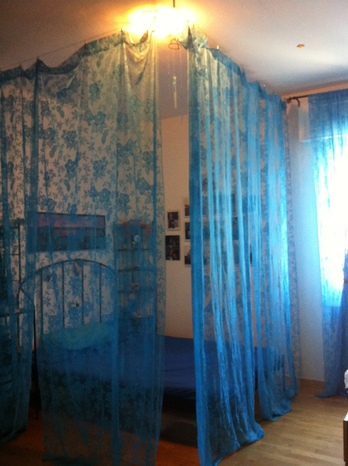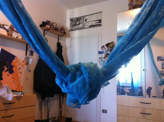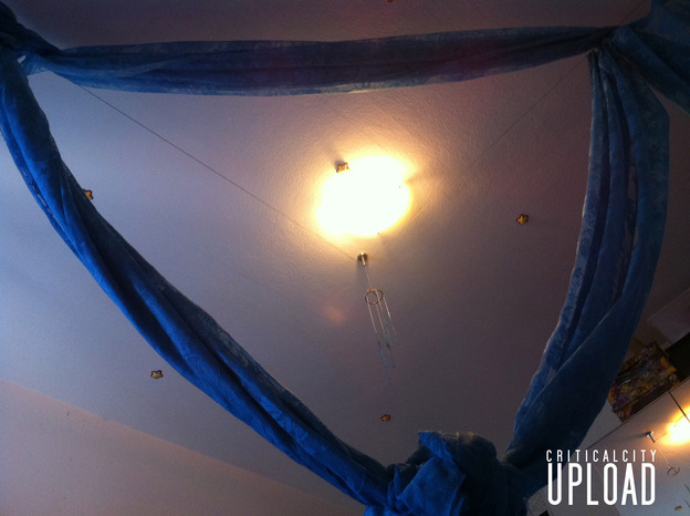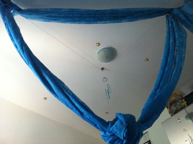 Giuro che stavo provando a prendere sonno.... Ma dopo due giorni come quelli appena trascorsi (grazie ragazzi, davvero!) ho ricominciato a vedere triangoli ovunque, come mesi fa quando cominciai a giocare... Ma la cosa grave è che qui ho visto un triangolo dove neanche c'era!! è bastato solo il plafone a darmi lo spunto del puntino centrale del logo e ho deciso anche che le tende del baldacchino fossero abbastanza verdognole da andar bene come triangolo!!