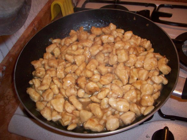 Tagliare le cipolline a pezzi piccoli e soffriggerle in una padella abbastanza grande in circa 4 cucchiai di olio di semi (per riempire il fondo della padella). Aggiungere 1 cucchiaino e mezzo di zenzero (se fresco tritato molto finemente). Lasciar appassire a fiamma molto bassa mescolando di tanto in tanto. Quando le cipolline sono morbide, aggiungere il pollo precedentemente tagliato a dadini (più o meno 2x1 cm) e abbondantemente infarinato. Lasciar cuocere il pollo sempre a fiamma bassa girandolo spesso, finché non è rosolato (ma non troppo!) su tutti i lati (più o meno ci vorranno 10-15 min). Quando il pollo è cotto, aggiungere mezzo bicchiere di acqua tiepida e 6 cucchiai di salsa di soia. Aggiungere infine le mandorle (a crudo o precedentemente tostate in forno) e mescolare finché non si forma un'abbondante salsina densa color nocciola.