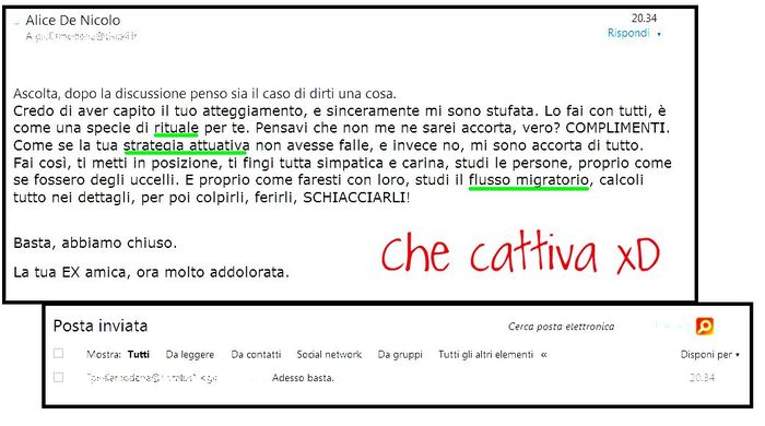 "Ehi!! Ma cosa stai dicendo?? Cosa vorrebbe dire "studi le persone?" Sei impazzita? Abbiamo discusso per una stupidata e ora mi dici basta , è finita la nostra amicizia? Sarei io ad avere una strategia o tu che non hai nemmeno il coraggio di chiamarmi? Vorrei capire meglio cosa ti passa per la testa , domani ci vediamo per un caffè. Non mi interessa se hai impegni vari . Ci conto"