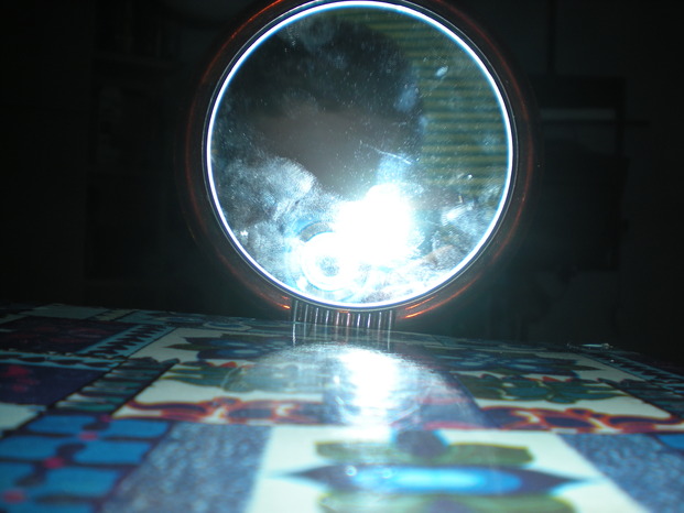 Visione laterale, quasi da duello western: la fotocamera è pronta a sparare allo specchio che si limiterà a rispedire al mittente il colpo. Sullo sfondo, non correlato, una palla di pelo: il mio gatto.