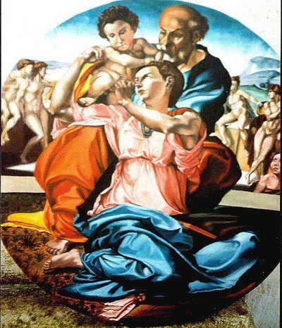 2°immagine:di Michelangelo Buonarroti, databile al 1506-1508 il dipinto al 1507 circa, in occasione del battesimo , come farebbero pensare le allusioni alla teologia battesimale Appena pronta l'opera, l'artista inviò un garzone per consegnarla, ma alla richiesta di settanta ducati come pagamento, il Doni, che era molto attento alle sue economie, esitò a "spendere tanto per una pittura", offrendone invece solo quaranta. Michelangelo allora fece riportare indietro il dipinto e acconsentì a recapitarlo solo a un prezzo maggiorato di centoquaranta ducati,