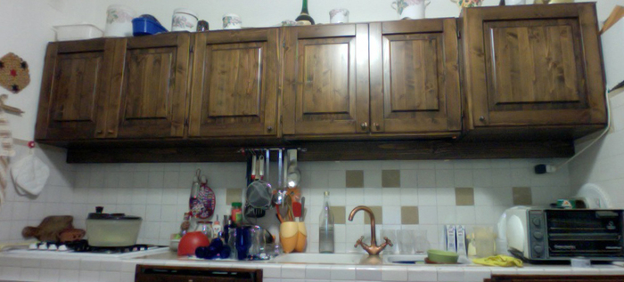 “Piatti sporchi, bottigliette appena lavate, stoviglie in genere, gli avanzi della cena, un fornetto, dei libri di cucina.”
