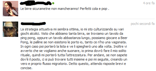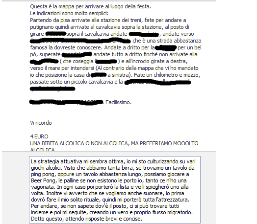 "La strategia attuativa mi sembra ottima, io mi sto culturizzando su vari giochi alcolici. Visto che abbiamo tanta birra, se troviamo un tavolo da ping pong, oppure un tavolo abbastanza lungo, possiamo giocare a Beer Pong, le palline se non esistono le porto io, tanto ce n'ho una vagonata. In ogni caso poi porterò la lista e ve li spiegherò uno alla volta. Inoltre vi avverto che se vogliamo anche suonare, io prima dovrò fare il mio solito rituale, quindi mi porterò tutta l'attrezzatura. Per andare, se non sapete dov'è il posto, ci si può trovare tutti insieme e poi mi seguite, creando un vero e proprio flusso migratorio. Detto questo, attendo risposte brevi e concise."