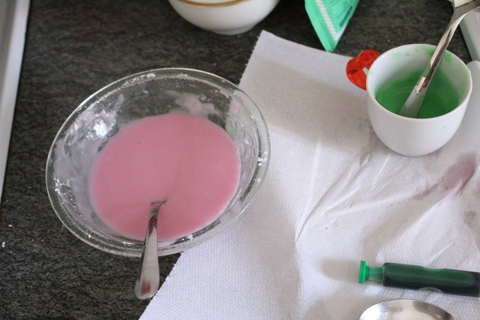 Come prima cosa le ho fatto vedere come si prepara la glassa. Verde al limone, rosa all'alchermes e bianca normale:) solo che quest'ultima è venuta troppo liquida, e quindi l'ho utilizzata come traslucida