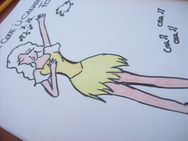 La ragazzina che canta è vestita tutta in giallo perché, appunto, si crede un canarino, non perché avevo solo matite colorate gialle xD Che poi accanto a lei c'è un canarino che scappa via disperato.