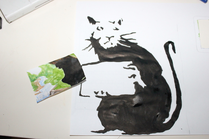 il grande dilemma era sul soggetto da dipingere.. e su come renderlo personale ed originale, ma non banale. Alla fine ho optato per un piccolo dipinto ad acquerelli ispirato ad una foto di me in motagna (stile ninja!) che valesse come ''parte personale'' e come cornice... beh.. su un muro, in città.. cosa ci può essere di meglio di Banksy? così ho optato per uno dei suoi topi che al posto del cartello ''you lie!'' reggesse il mio piccolo dipinto.