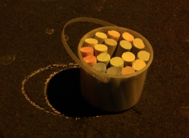 Per strada traccia il contorno di un'ombra con dei gessetti colorati.