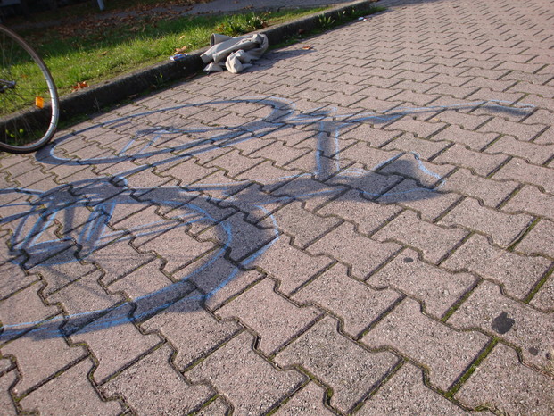 Per strada traccia il contorno di un'ombra con dei gessetti colorati.