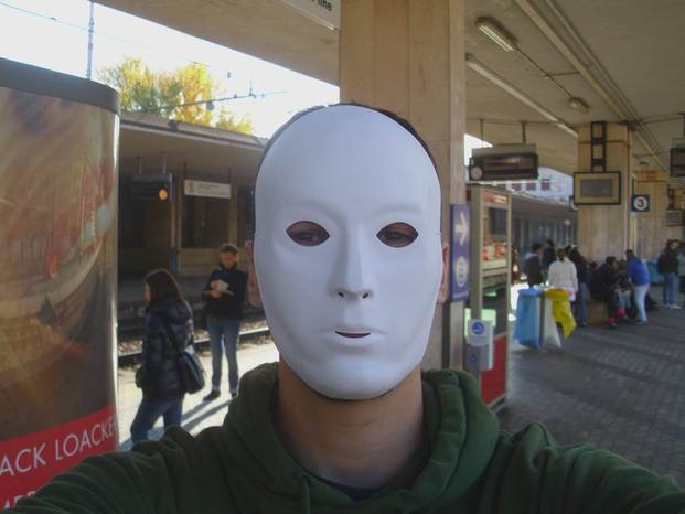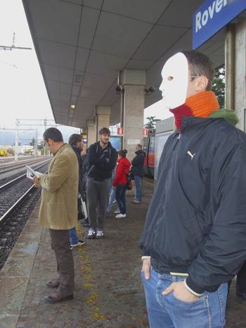 Combinando maschera bianca e treno è nata questa riflessione: quante volte ci accorgiamo delle persone che abbiamo intorno? Quasi mai: siamo presi dalla nostra vita, dalla nostra frenesia e non diamo un'occhiata in giro.