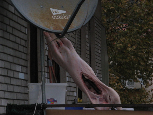 Un maiale già sventrato,impalato e pronto per essere messo sul girarrosto...
