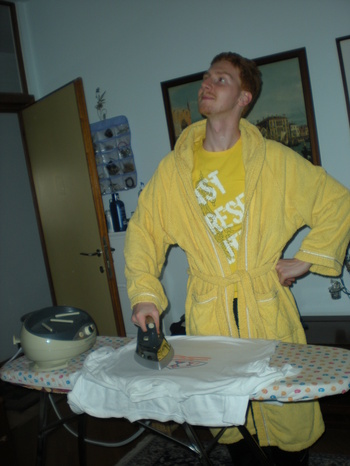 Nel pomeriggio un casalingo VB tirò fuori tutte le sue capacità di stiratore professionista e le mise in pratica. L'intelligenza visiva (sempre che esista) di VB gli suggerì che la scritta sarebbe dovuta apparire dritta sul dorso della maglia, ma così stampata sarebbe dovuta essere sitrata al rovescio.