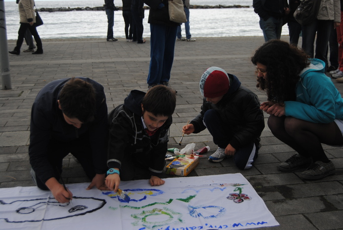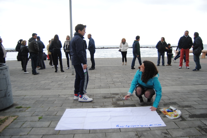 Mi sono procurata la tela, sono andata al mare. E l'opera d'arte non l'ho creata da sola, bensì con l'aiuto di tanti bambini disponibilissimi!!