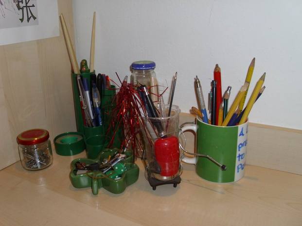 Quanto agli altri, vengono anche illustrate le fasi di creazione del portapenne e la sua posa in opera. Ho dovuto solo consumare del nastro adesivo per tenere insieme alcune parti, ma il grosso del lavoro lo svolge il fil di ferro.