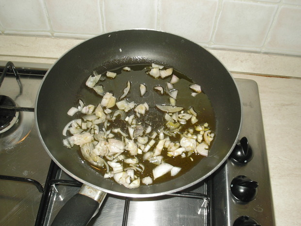 versiamo la cipolla in pentola e facciamo un soffritto, senza esagerare con la cottura delle cipolle...