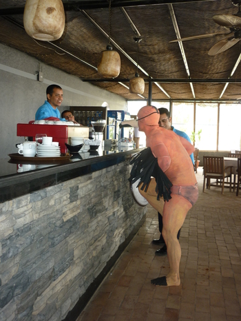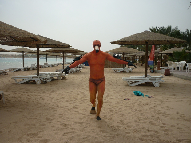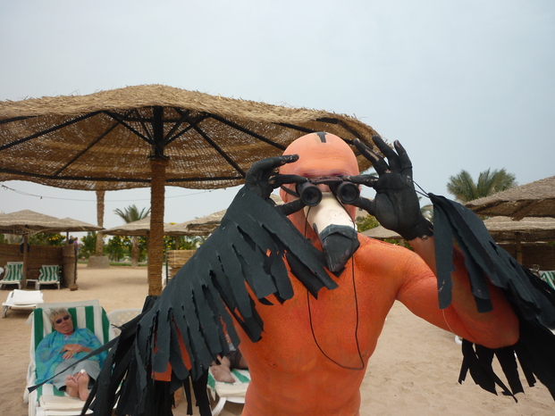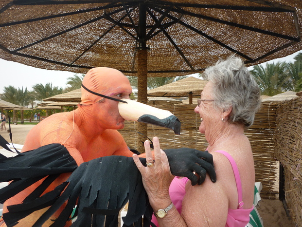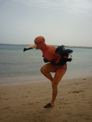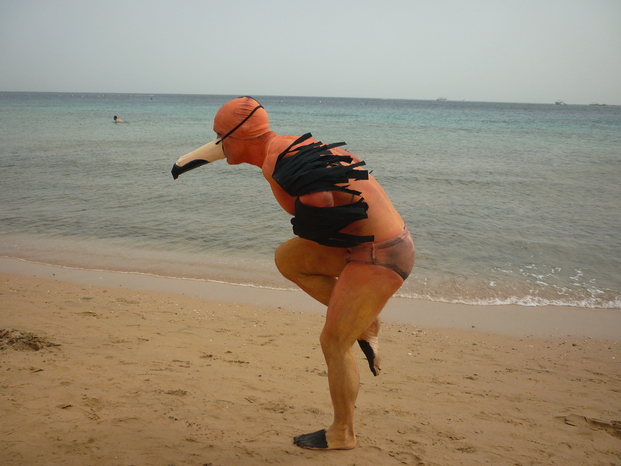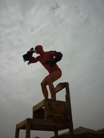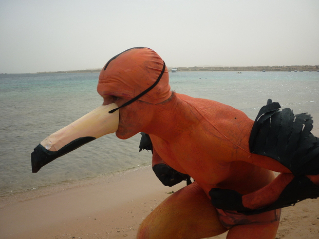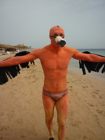 Abbiamo dovuto usare quintali di tempera per riuscire a coprire tutto il corpo, cosa che ha richiesto quasi 2 ore di preparazione, e mi sono quasi cavato un occhio incastrandomi con il becco sulla sedia del bagnino, ma il divertimento è stato SUPER!!!