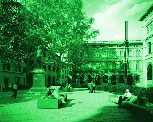 Questa piazza è, suo malgrado, fredda. E non è fredda solo per la temperatura, è proprio fredda tutta. Freddi i colori, fredde le impressioni. Fredde le facce della gente che entra ed esce dagli uffici. Azzurra, fredda.