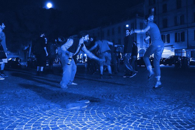 Qualche ora più tardi, o più presto, nelle strade lì accanto, tra due macchine, qualcuno sta pomiciando pesantemente, ma è notte. E la notte (è blu ed) è amica di chi sta in piazza San Francesco.