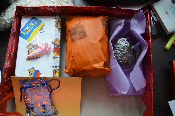 Prepariamo il pacchetto: ringrazio la collaborazione forzata di mia mamma che è rimasta senza scatola per i suoi stivali. Sotto, armamentario con gatto che mangia lo scotch e la scatola
