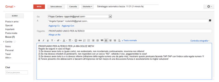Ecco così il mio prontuario inviato alla mia ragazza, per cercare di evitare, nei momenti post-litigio, di rovinare ulteriormente la situazione.