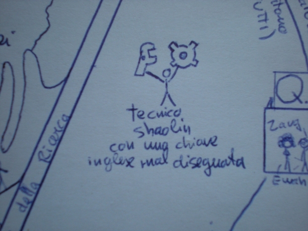 E il tecnico Shaolin con una chiave inglese mal disegnata (come se quell'altro si capisse bene che è un ingranaggio).