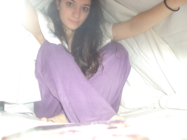 Ho scoperto che usare l'autoscatto sotto le lenzuola è estremamente complicato. Per prima cosa bisogna sistemare la macchina fotografica in modo che non fotografi il basso e già questo è stato un problema. Infatti quella maledetta continuava a cadere e io (che già non ci vedevo una cippa lippa per via del buio) ho preso una cosa completamente a caso (l'album di starzone dell'esselunga) per tenerla su. Una volta impstato l'autoscatto partono 10 secondi in cui bisogna riuscire a