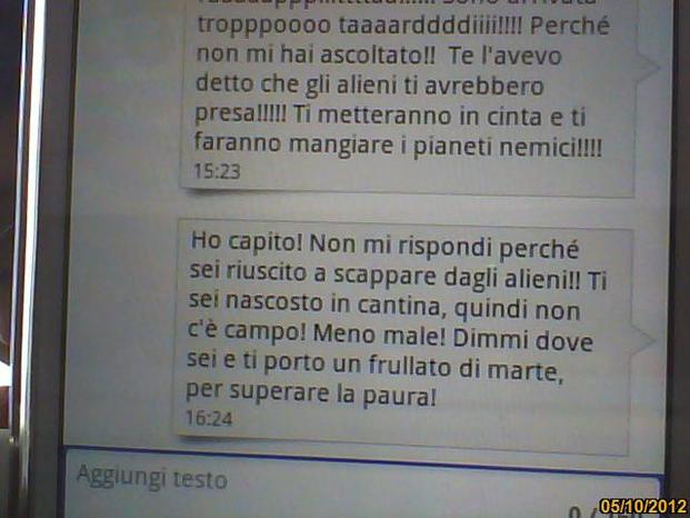 La mia amica e collaboratrice Mellshyre mi ha fornita di un numero telefonico di un suo conoscente. Gli ho scritto un messaggio...scatenando la mia più fervida fantasia, ho cercato di scrivere un messaggio assurdo e sconvolgente! ... ... ... ... ... Nessuna risposta... ... ... ... ... Boh...non avrà letto il messaggio? poco dopo ho scritto il secondo messaggio, sconvolgente anch'esso... ... ... ... ... Nessuna Risposta... ... ... ... Ho scritto il terzo messaggio...temevo che la mia vittima fosse sconvolta e spaventata dai messaggi precedenti, e ho scritto un messaggio meno spaventoso...ma ugualmente assurdo... ... ... ... NESSUNA RISPOSTA!!!! La mia pazienza e il mio credito stavano esaurendo...ho informato Mellshyre del mio problema, e non so con quale scusa è riuscita a contattare la mia vittima ed è venuta a sapere che questo non aveva credito nel cellulare! Bah, bah, bah...Mellshyre, mi ha dato un altro numero di un'altro suo conoscente, questa volta la ma fantasia era esaurita e con l'aiuto di un mio compagno di classe ho scritto un messaggo completamente senza senso... ... ... ... Mi ha risposto con un banale: "chi sei?"... Allora non sono io l'unica ad aver esaurito la fantasia....