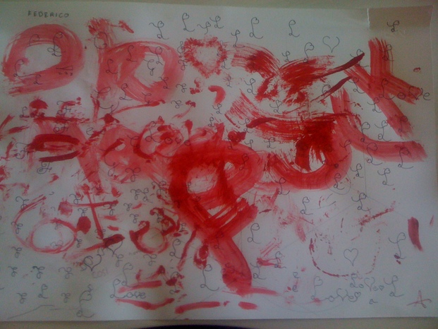 Beh come ogni opera, anche la mia ha un significato più recondito: (della serie ''le cose che ti inventi a scuola quando vedi un quadro'') infatti esso rappresenta l'amore, col colore rosso.. la pittura è molto violenta come il sentimento passionale che appunto si prova e mai della stessa sfumatura, proprio perchè secondo il magnificissimo artista l'amore non è mai uguale ma sempre in continua evoluzione. Inoltre si può notare chiaramente il taglio del foglio (in alto a destra) che indica la vita, infatti se preso nel modo sbagliato l'amore, secondo questo sommo artista contemporaneo, può non farti provare tutte le emozioni e quindi in un certo senso toglierti la vita. Le scritte che il grande artista ha fatto col rapido, rappresentano i pensieri, che a volte sono sovrastati dal rosso (l'amore) o altre volte giungono molto chiari ma sono sempre correlati all'amore (vedi scritte ''love'' e i cuori). Le scritte in matita grigia e difficilmente individuabili, rappresentano invece gli impegni i quali sono sormontati sia dai pensieri che dall'amore poichè meno importanti di questi. Dopo una maggiore osservazione dell'opera si può notare che sono presenti anche le lettere ''F;G'' scritte con inchiostro con ciò il sommo pittore ha voluto rendere partecipi gli osservatori della sua storia d'amore con un'altra persona, che come si può vedere dalla biografia dell'autore (che non starò a mettervi qui) inizia appunto con la lettera ''G''.