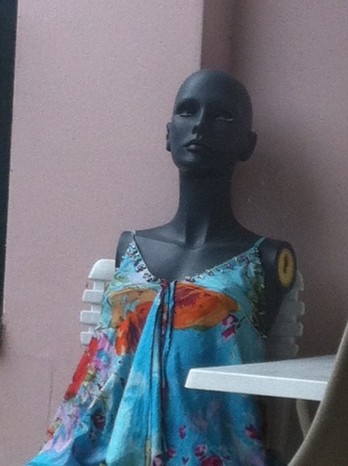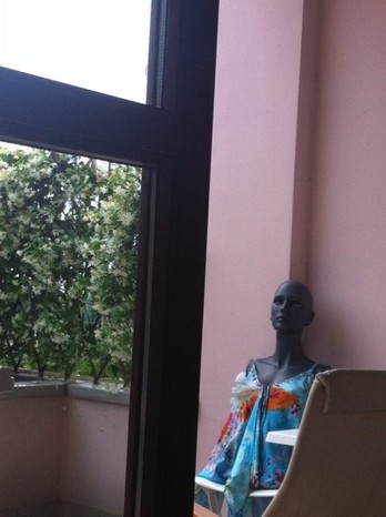 Oggi e' una giornata uggiosa, di uscire non ho molta voglia, guardo dalla mia finestra (E' UNA PORTAFINESTRA IN REALTA') e vedo un cielo un po' grigio, avevano previsto pioggia per il week-end...a dare colore alla mia vista c'e' una siepe fiorita e profumata di gelsomino e Wendi,la mia coninquilina manichino... lei e' seduta sul balcone con un abitino che le ho regalato pochi giorni fa, molto colorato e adatto per la stagione. Di fianco a lei c'e' un tavolo da giardino bianco e una poltrona ikea un po' sbragata.In terra sempre vicino a lei ci sono i petali di gelsomino che man mano appassiscono cadono e per puro caso un fiorellino invece di cadere come tutti gli altri e' rimasto appeso nel vuoto perche' nella caduta s'e' appoggiato su una ragnatela invisibile