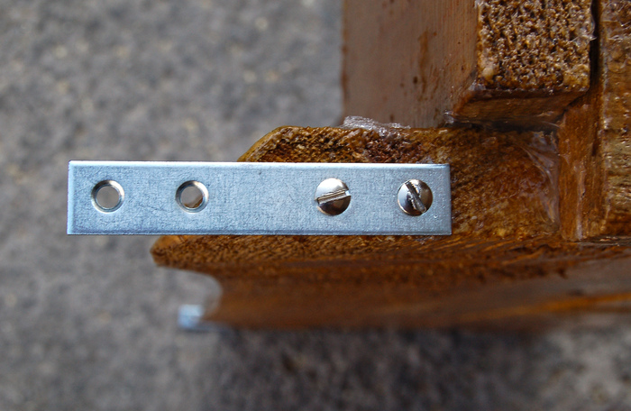"meccanismo" di chiusura/apertura vani lettere: un gancio per cornici fissato alla tavola mobile si chiude su una vite zincata