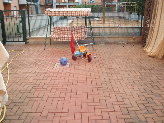 Una palla blu con triciclo abbandonati abbandonati; un dondolo resistente alle intemperie; un gazebo avvolto dalle tende e una canna gialla.