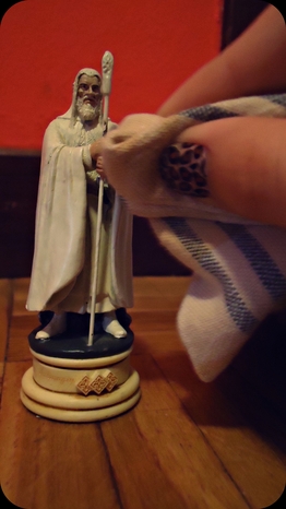 « Tutto quello che l'ignaro Bilbo vide quel mattino era un vecchio con un bastone. Aveva un alto cappello blu a punta, un lungo mantello grigio, una sciarpa argentea sulla quale la lunga barba bianca ricadeva fin sotto la vita, e immensi stivali neri. »