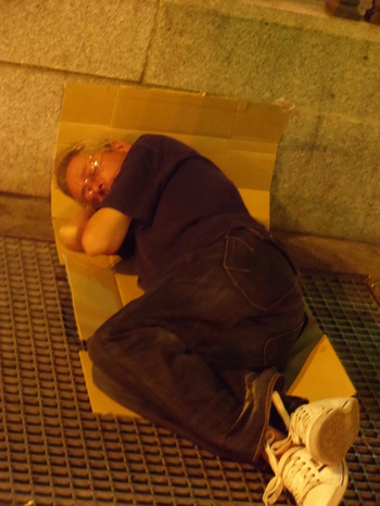 Trova una persona che sta dormendo in un luogo pubblico e fai una foto in sua compagnia.