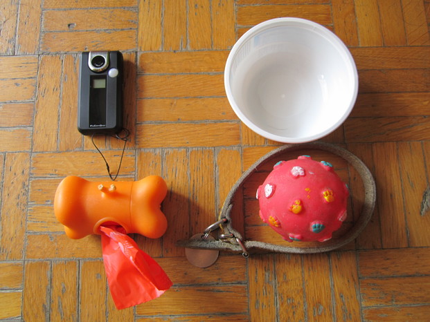 necessaire: flyCamera per Zazie, ciotola per l'acqua, sacchetti, collare, palla.