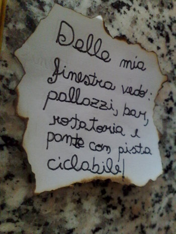 Ecco il secondo tentativo di compiere questa missione!!! Speriamo di avercela fatta!!! L'aiuto mi è giunto dal genio di Leonardo: ho deciso di descrivere ciò che vedo dalla mia finestra utilizzando la grafia speculare perciò corrette a munirvi di specchietto!!!