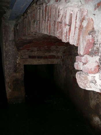 Il tunnel si stringe, ora è tutto di mattoni e archi e l'acqua diventa più alta e più impetuosa