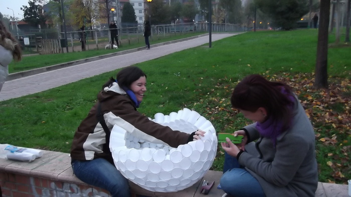 Realizza un elemento di arredo urbano utilizzando contenitori di plastica destinati al riciclo. Lascia ai passanti il tempo di godersi la tua opera, poi smonta e ricicla il tutto.