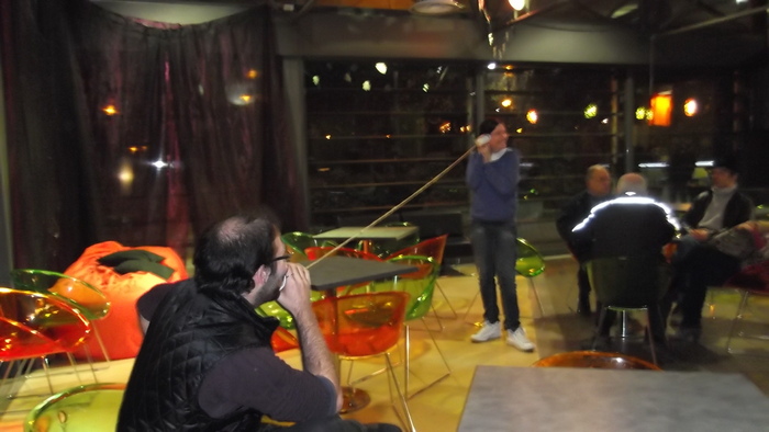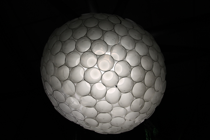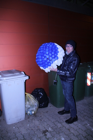Abbiamo deciso di interpretare entrambi i significati del termine “RICICLA”, così una lampada lunare è finita nel bidone della plastica mentre l’altra è stata montata come decorazione per una serata speciale allo Spazio A di Sesto San Giovanni. Abbiamo anche riciclato due bicchieri che si sono staccati dalla composizione improvvisando un telefono senza fili.