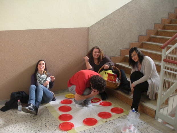 Con una bella giornata di sole... l'ideale era un pic-nic...! Stavamo per scendere all'aria aperta.. ma la fame era tanta... e la scala d'emergenza era più vicino alle nostre esigenze!