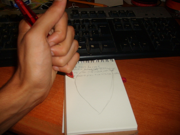 Mi trovai, così, a leggere "Amore di mano". -Perché dovrei scrivere con la mancina quando sono destrorso?- Questa era la domanda che m'assillava mentre scrivevo su quel foglietto bianco. Scrivevo e lottavo con la voglia (e la necessità) di scrivere con la destra. Dopo parechio tempo (non si direbbe dalla grandezza del foglietto, eh?) riuscì, finalmente, a concludere la lettera.