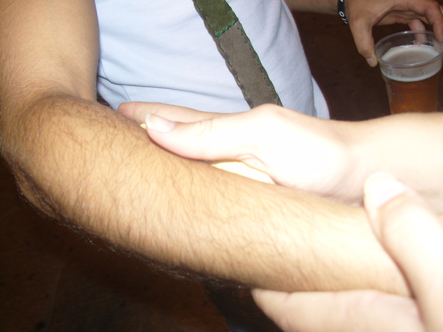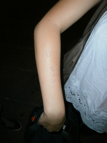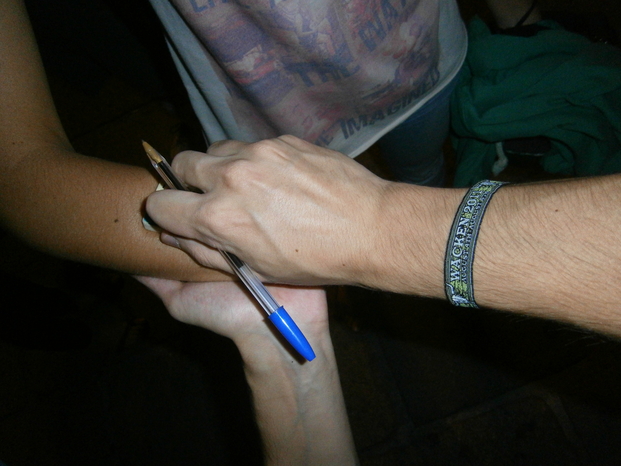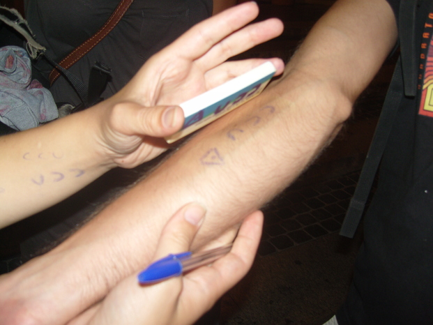 Il primo di loro si fa timbrare subito, l'altro... esita un po'... il volto titubante... ma poi, visto che noi eravamo già timbrati (eh sì, dovevamo pur testarlo!) e il suo amico non era ancora morto, si butta anche lui in quest'avventura, e ora ha un timbro sul braccio anche lui! :D