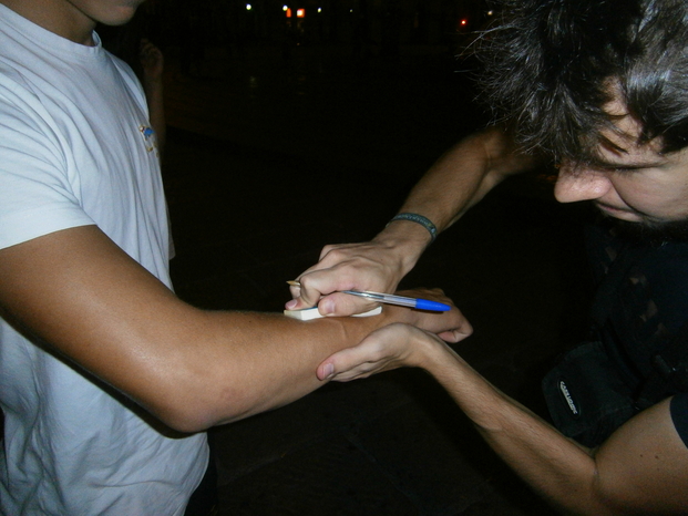 E infatti si mostrano subito disposti ad essere marchiati, senza nemmeno sapere se l'arma fosse realmente una gomma, oppure nascondesse della colla a caldo che li avrebbe bruciati e tatuati a vita. Ad ogni modo, timbriamo e... arrivano altri due ragazzi, loro amici! E poi altri due! Eh sì, erano un gruppetto di scout, un po' di cu.. fortuna ogni tanto! :D