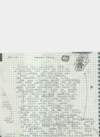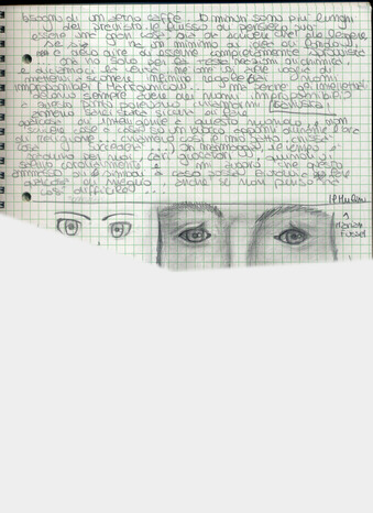 Premettendo quanto mi ripugni l'esecuzione di questa esecuzione, eccola a voi in tutto il suo splendore ! (ho dovuto tagliare parte dell'immagine perchè, essendo il mio quadern degli appunti, non credo vi interessino scarabocchi di filosofia e disegni inutili, spero non vi arrabiate per questo :) ) . Scusate gli innumerevoli errori di grammatica, ma non ho voluto fare una revisione perchè avrei abbondantemente sforato il tempo concessomi, quindi perdonate la mia ignoranza ...
