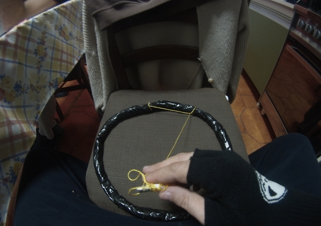 si punta il filo con un primo nodo e si fanno nodi equidistanti lungo il cerchio