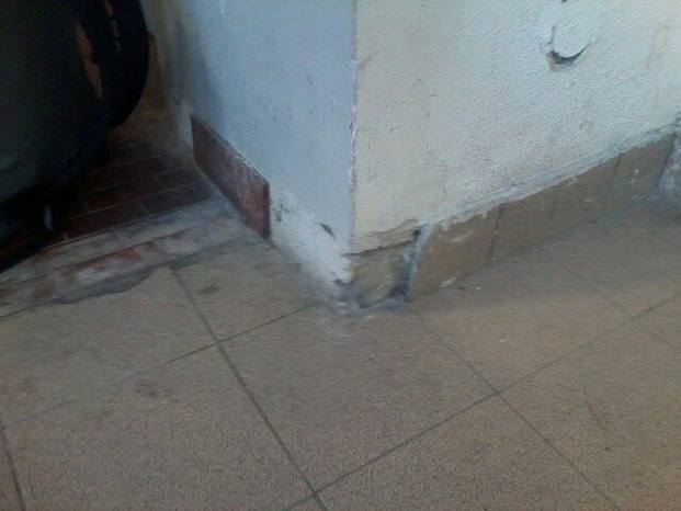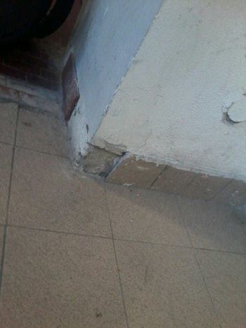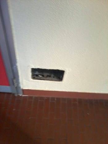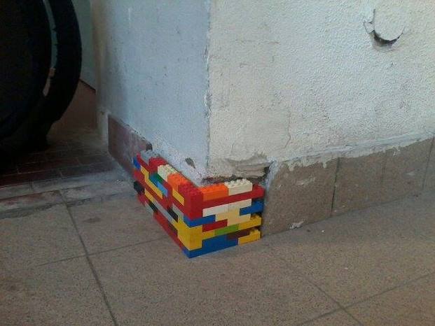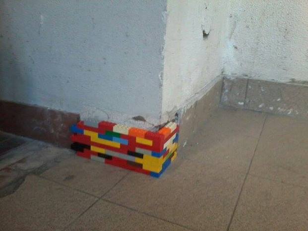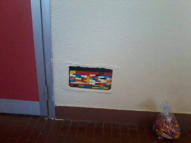 Con dei lego, riempi un buco in un muro pubblico.
