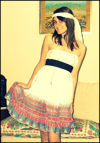 Si, lo so che sa più di anni 60 e che la gonna deve essere lunga ma è quello che ho trovato in casa.. E poi ho letto che negli anni 70 si usava ancora la bandana messa così. ._.