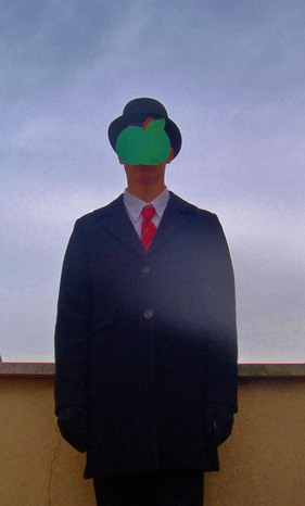 Fortunatamente a me è venuta in mente l'idea di questo quadro di Magritte, molto semplice e anche abbastanza carino. I vestiti li avevo già e mi mancava solo il costruire la famigerata mela, ma anche fare quella è stato abbastanza semplice usando un semplice cartoncino, e anche se non è venuta molto realistica è abbastanza simpatica.